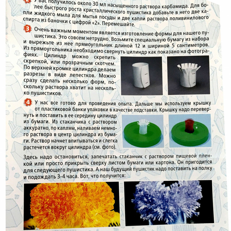| Отзыв: | простая инструкция, все пушистики одинаковы только цвет разный. Вообще дети ожидали большего результата, то что на фото появилось спустя 6-7 часов, уже потеряли интерес. Раствор был согласно инструкции, в стакан я добавил капли жил мыла и капли спирта из комплекта, кинул остаток бумаги, результат тот же, то есть почти никакой :) не интересно, реальная цена не более 50р. |