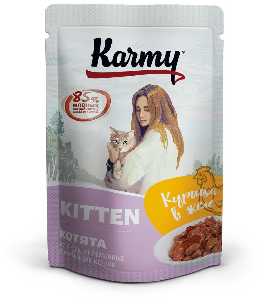 Купить Влажный корм для котят и беременных кошек Karmy Kitten, курица 24 шт. х 80 г (кусочки в желе)