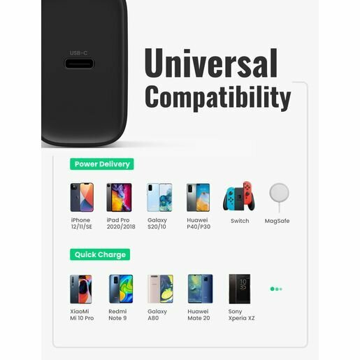 Зарядное устройство UGREEN CD137 Fast Charging Power Adapter With PD 20W EU