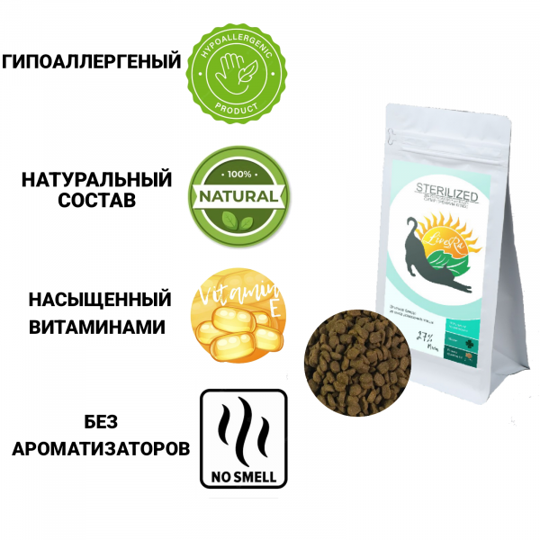 LiveRA Полнорационный сухой корм для стерилизованных кошек STERILIZED, 0,35 кг- элитное блюдо из мяса домашней птицы