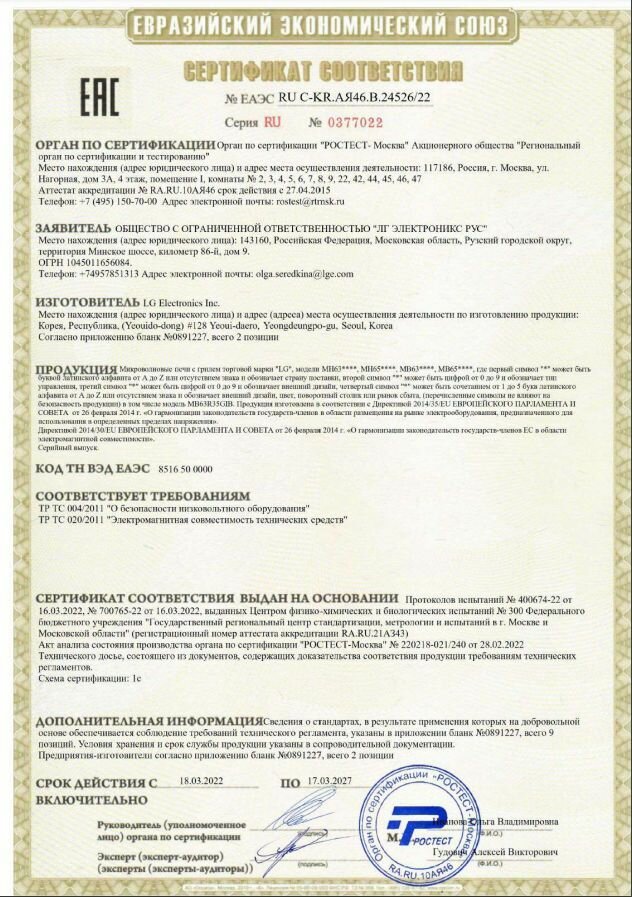 | Дополнительные режимы | автоматическая разморозка / автоматическое приготовление / звуковой сигнал отключения |
