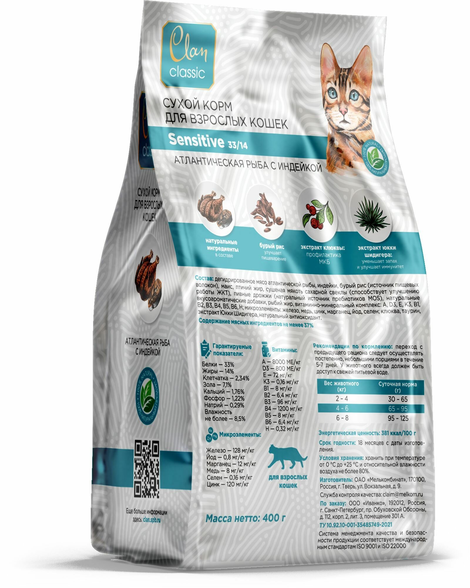 Сухой корм для кошек с чувствительным пищеварением CLAN Classic Sensitive-33/14 Рыба и индейка, 400г