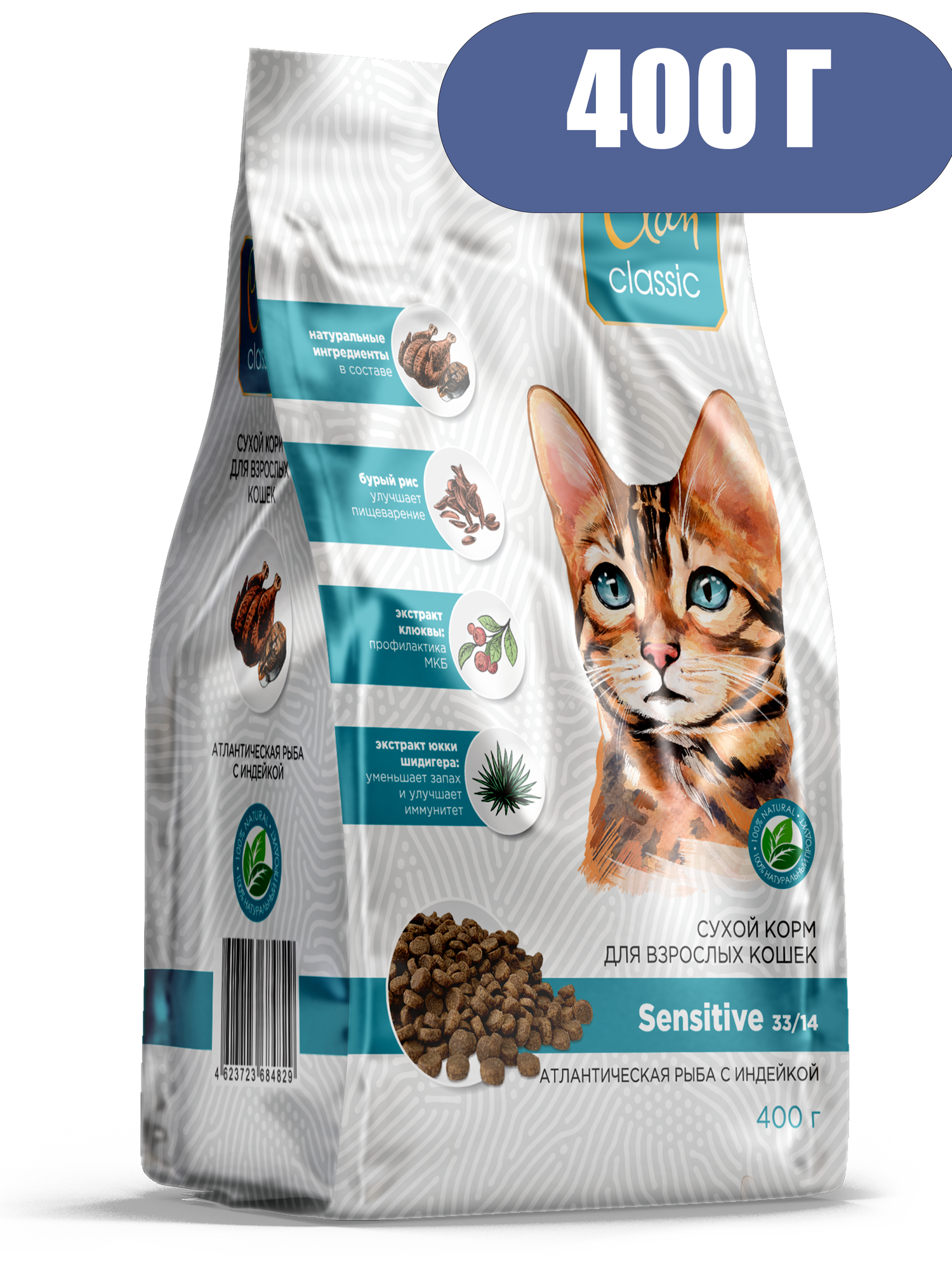 Сухой корм CLAN CLASSIC Sensitive-33/14 атлантическая рыба/индейка для кошек с чувствительным пищеварением 0,4кг