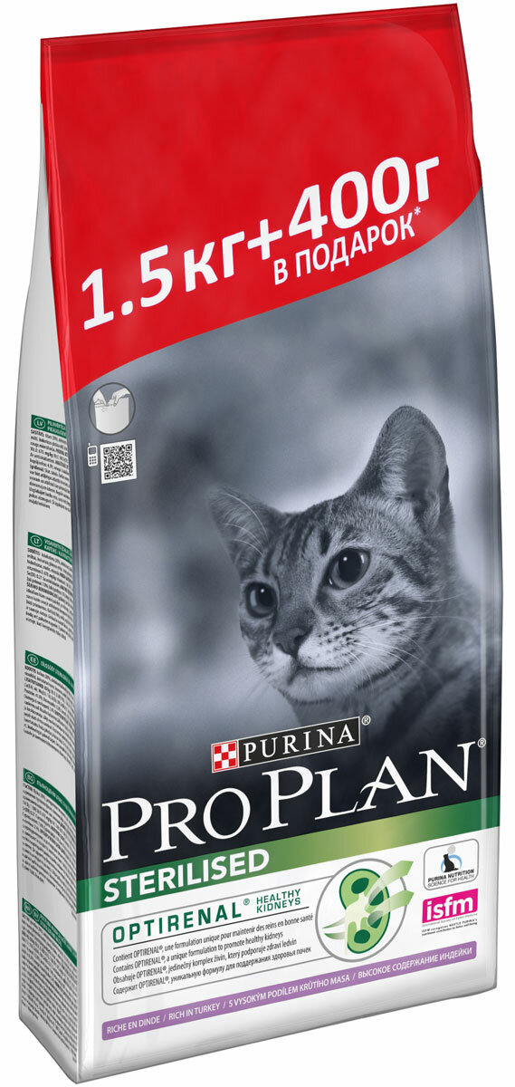 PRO PLAN Sterilised Turkey корм для взрослых кастрированных/стерилизованных кошек, с индейкой 1,5кг+0,4кг