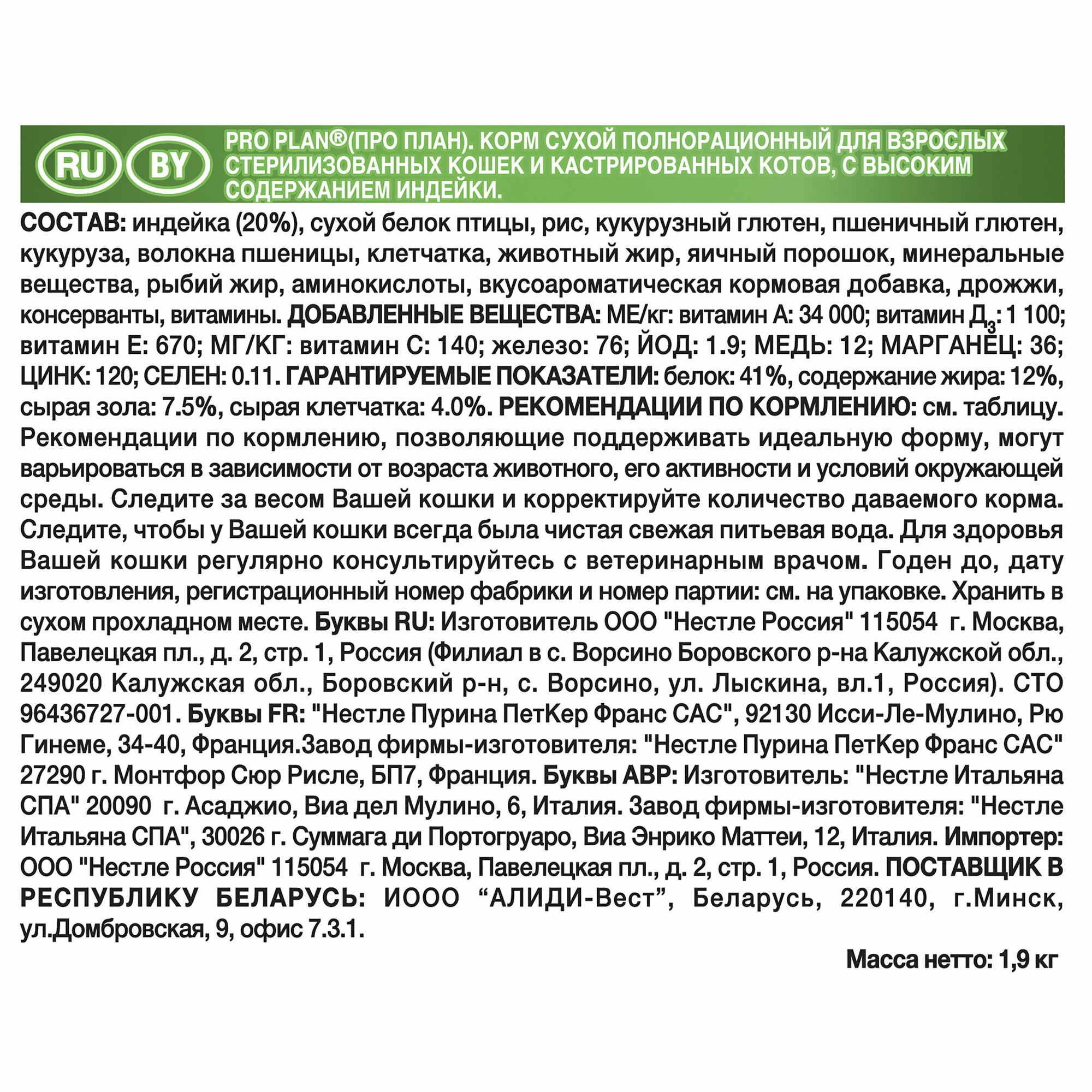 Purina Pro Plan Набор 1.5кг + 400г в подарок Для Кастрированных кошек с индейкой и курицей (Sterilised Turkey) - 12400595 | Sterilised Turkey, 1,9 кг, 213840