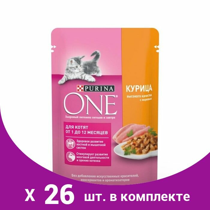 Влажный корм Purina One для котят, курица с морковью, пауч, 75 г*26 шт