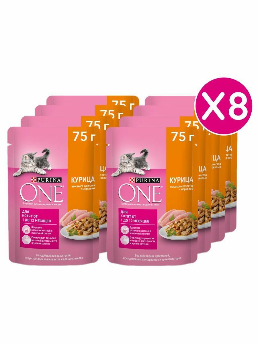 Купить Влажный корм для котят Purina One Kitten, с курицей и морковью, кусочки в соусе 75г 8 шт