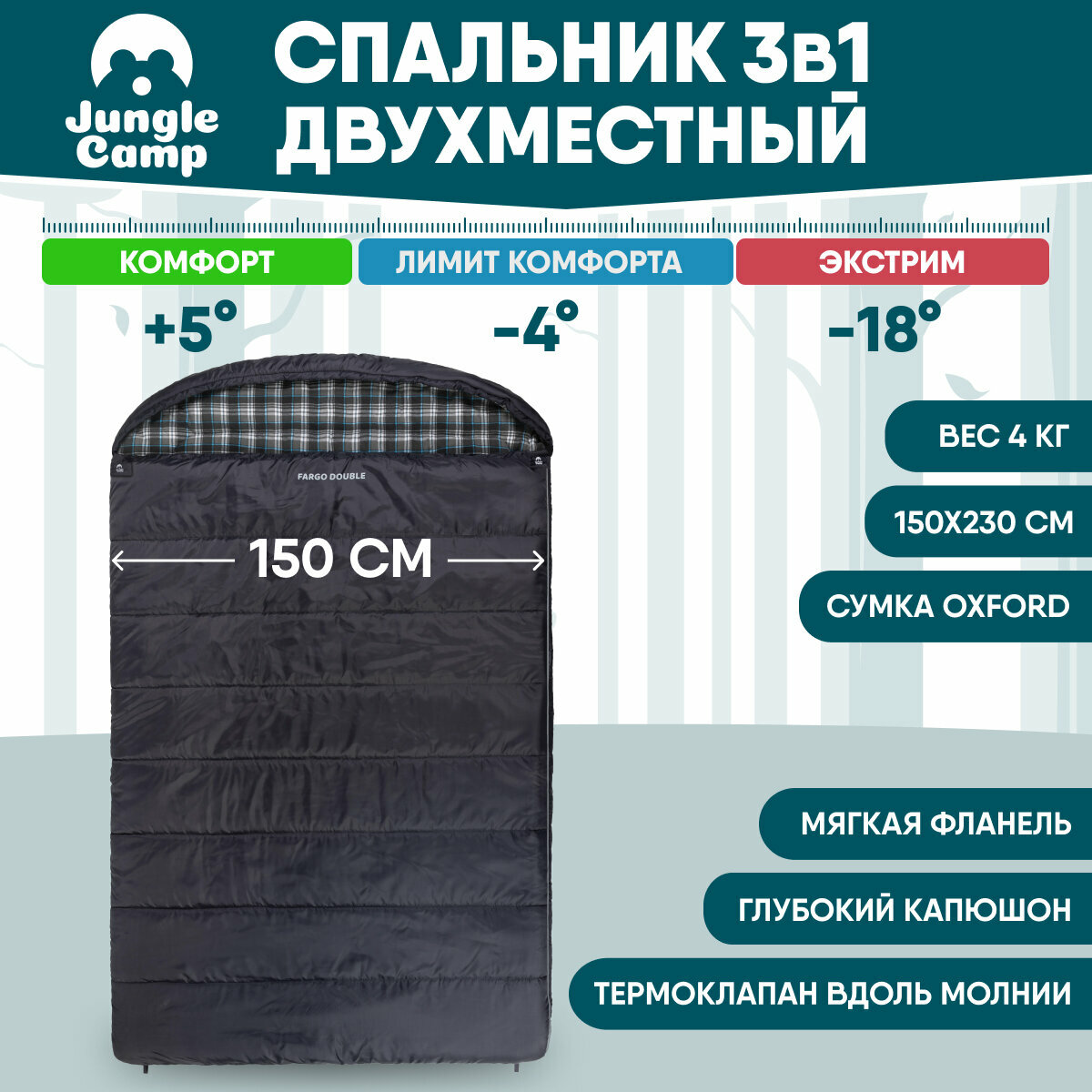 Спальный мешок Jungle Camp Fargo Double, двухместный, с фланелью, цвет: серый интересное: