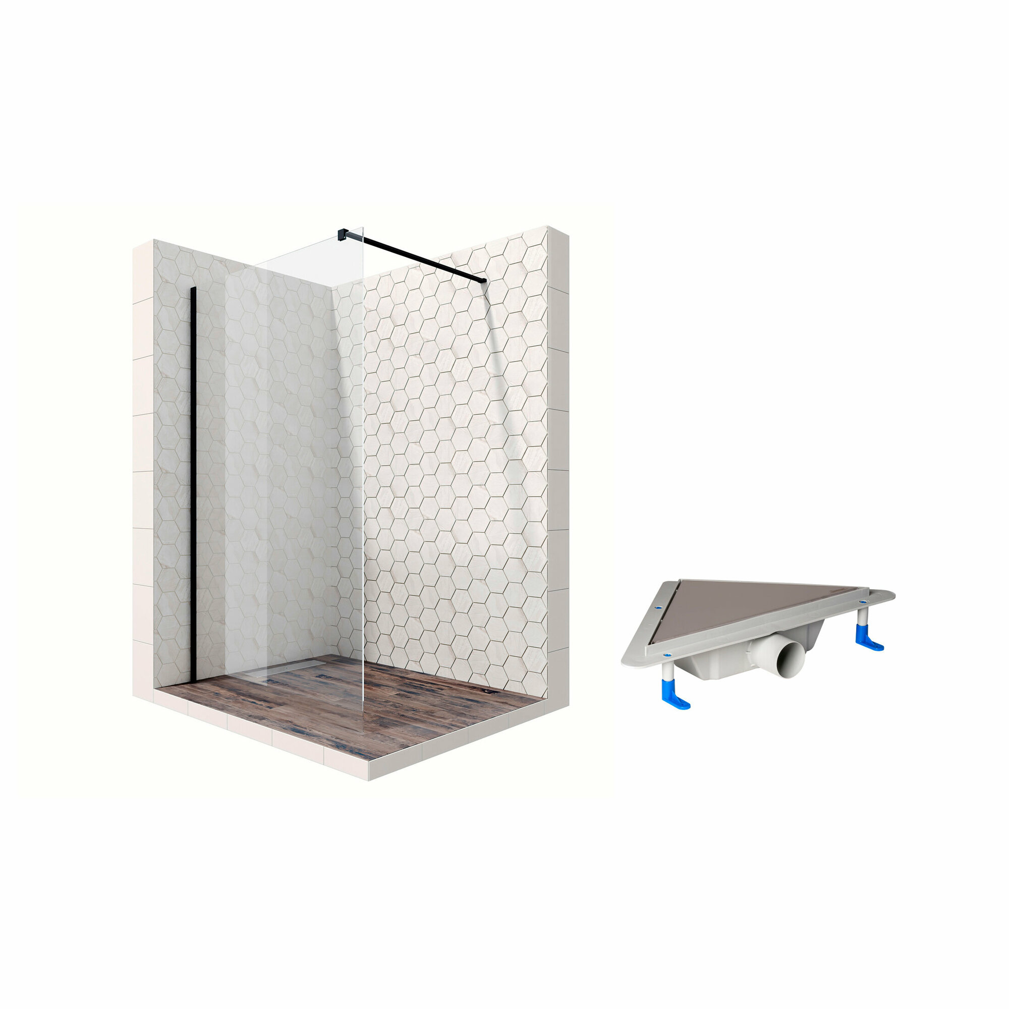Душевая перегородка 90 см с трапом и свободным входом Ambassador Walk-in 15031109-ST15: душевая ширма из стекла 8 мм, профиль черный