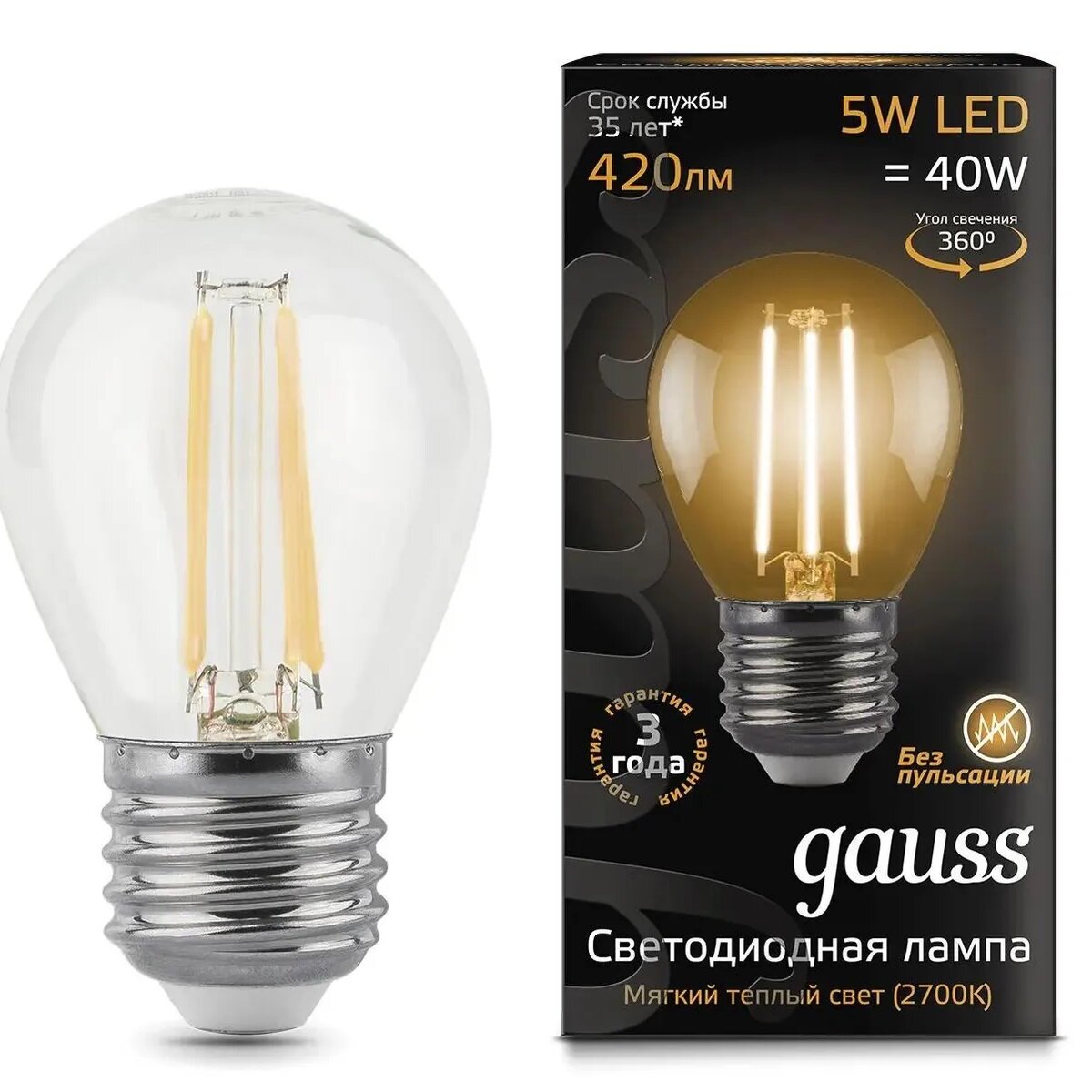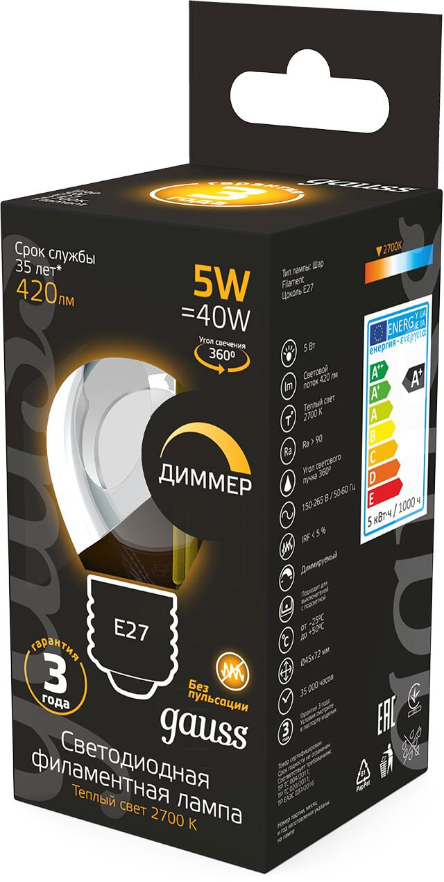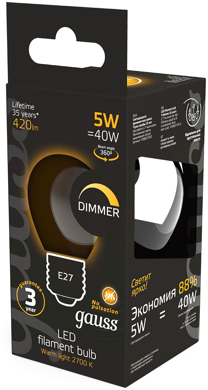 Лампа GAUSS филам. 5Вт цок.:E27 шар 220B 2700K св.свеч.бел.теп. G45 (упак.:10шт) (105802105-D)
