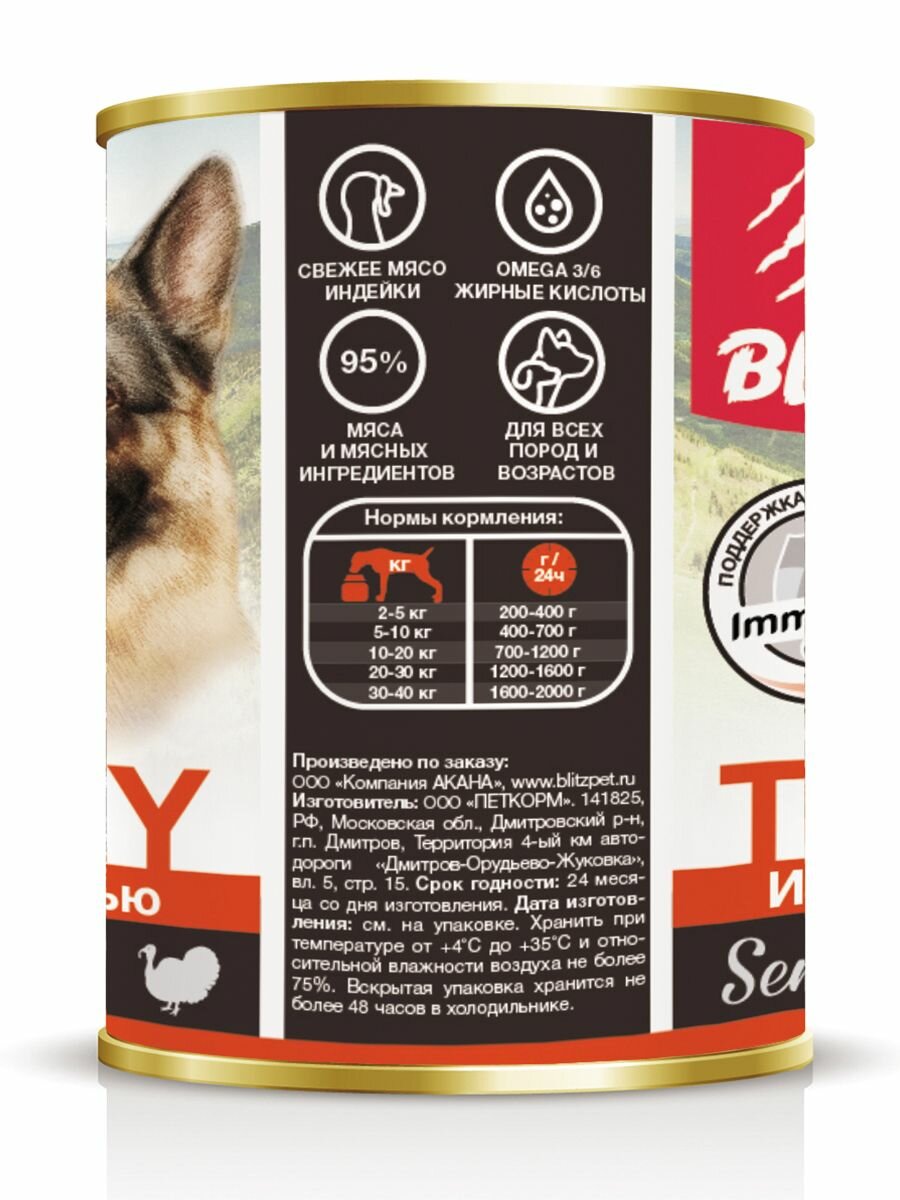 Корм для собак BLITZ индейка, печень банка 400г (упаковка - 24 шт)