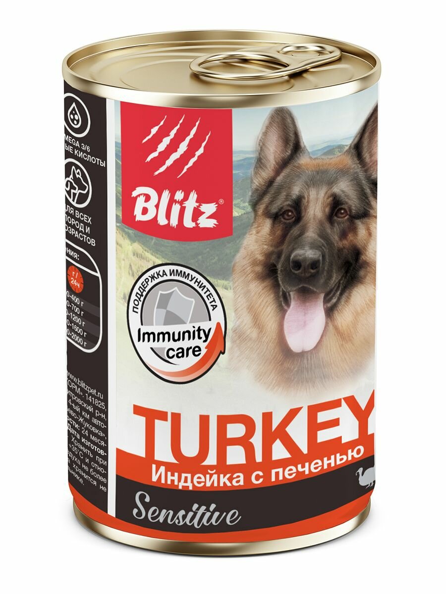 Blitz Sensitive консервы для собак всех пород Индейка и печень, 400 г. упаковка 24 шт