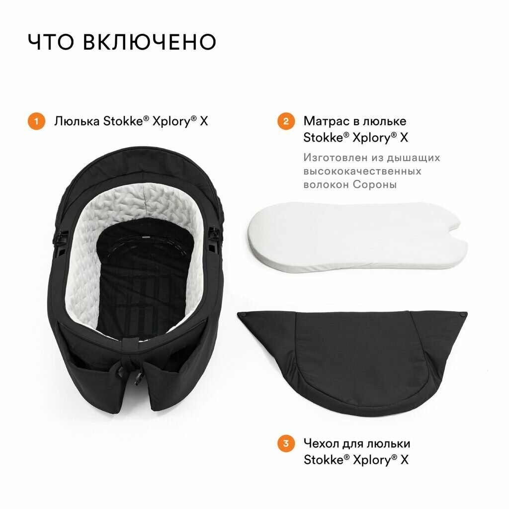 | Комплектация | Люлька-переноска к коляске Stokke® Xplory® Х, съемный чехол-фартук Stokke® Xplory® X, stokke® Xplory® X матрас со съемным чехлом |