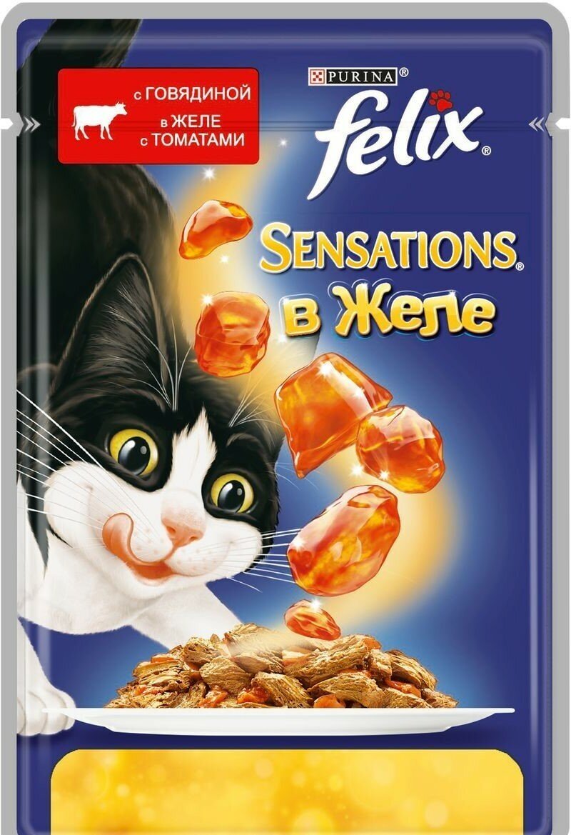 Влажный корм FELIX Sensations для взрослых кошек, с говядиной в желе с томатами, Пауч, 85 г, 24 шт