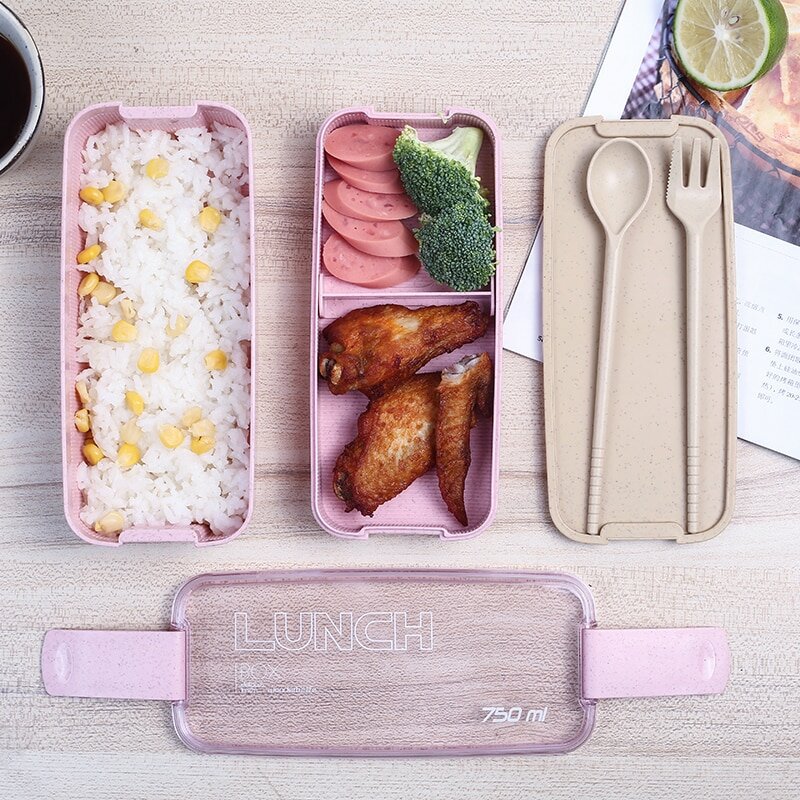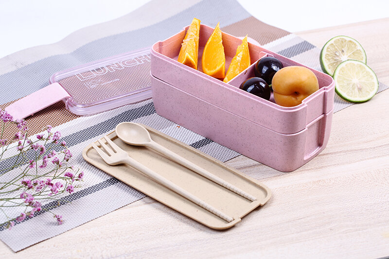 Купить Ланч-бокс со столовыми приборами, контейнер для еды пластиковый двухуровневый, 750 мл, розовый