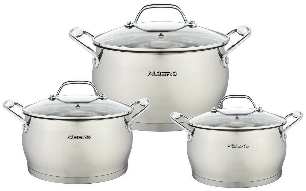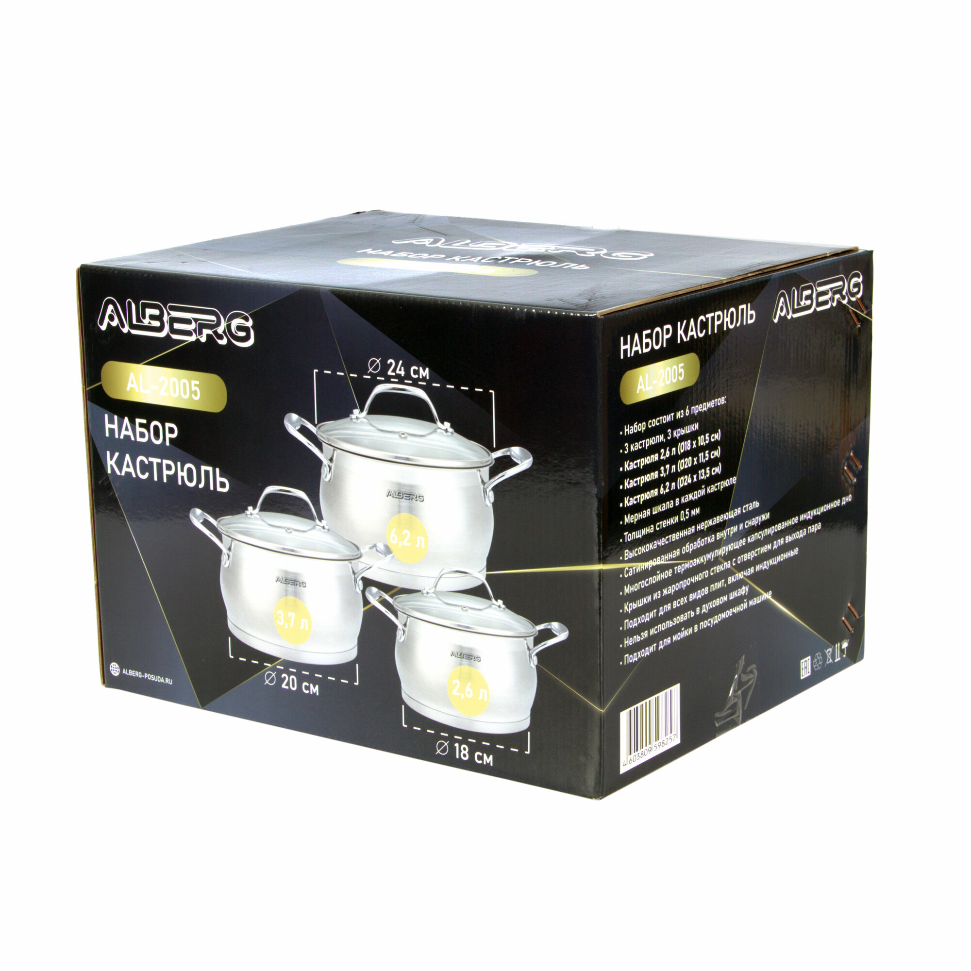 Купить Набор кастрюль ALBERG AL-2005 6 предметов, 2.6л/3.7л/6.2л, нержавеющая сталь, индукция, стеклянные крышки