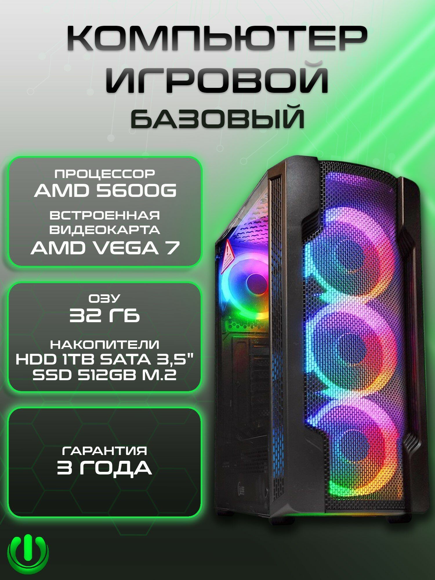 Игровой компьютер PREON STRIX MS (AMD5 5600G, B450M,32Gb, SSD 512Gb, AMD VEGA7,600W, Win10 PRO, HDD 1Tb, MS Office)