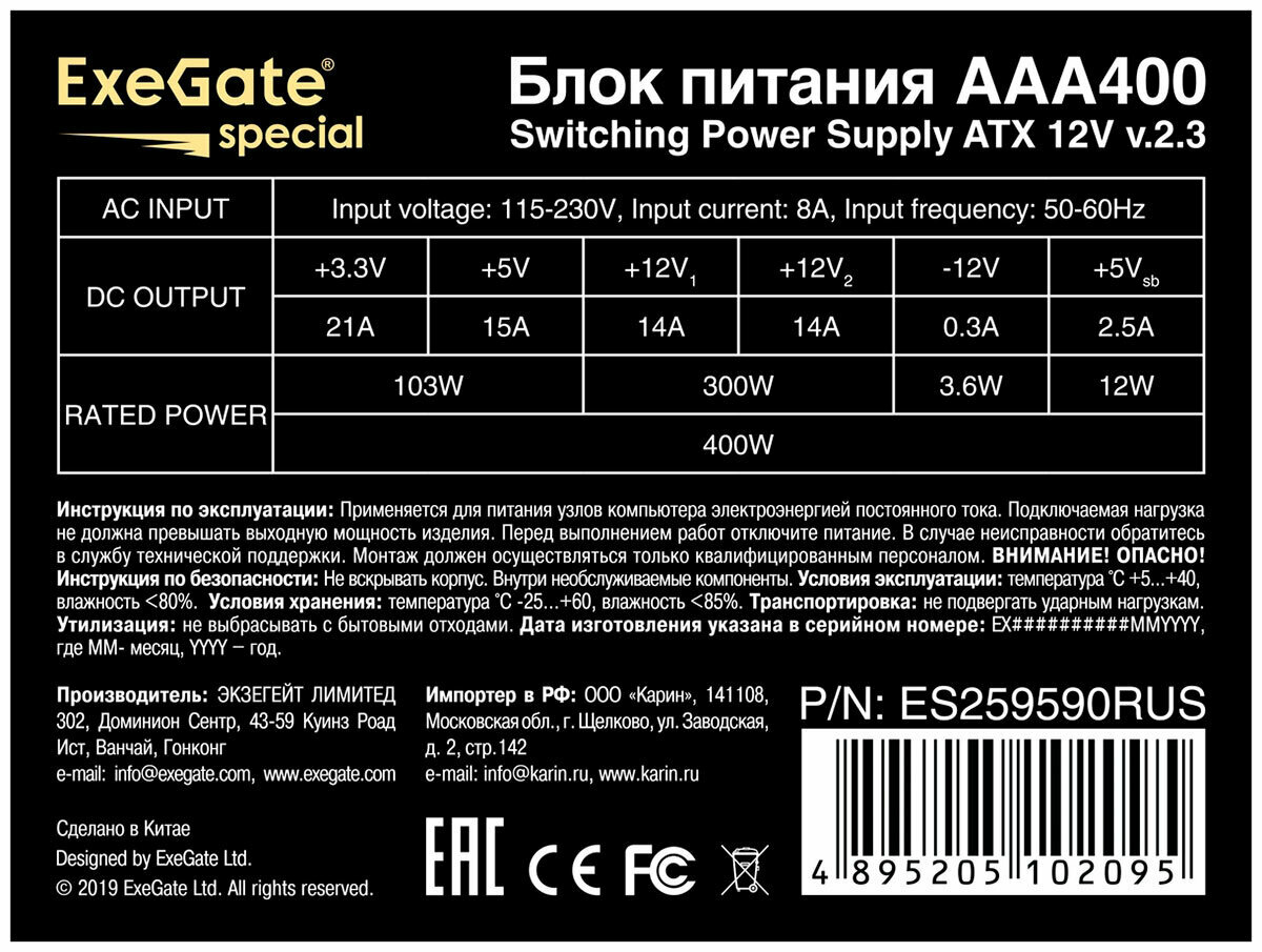 Блок питания EXEGATE AAA400 400W (ES259590RUS)