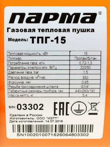 Тепловая пушка газовая Парма ТПГ-15, арт. 02.011.00013 интересное: