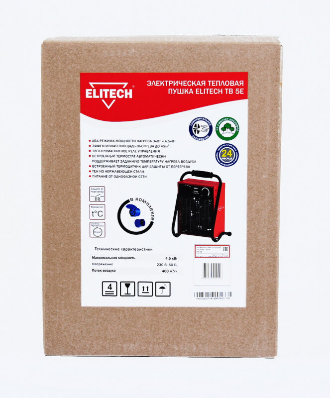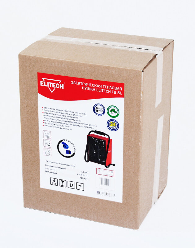 Тепловая электрическая пушка ELITECH ТВ 5Е 230В,3000-4500Вт,поток-400м3\ч,термостат,силовая вилка+розетка