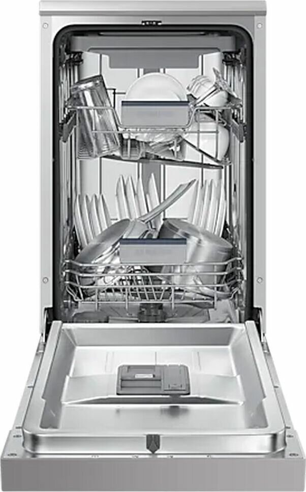 Узкая посудомоечная машина для кухни Samsung DW50R4050FS/WT, 1800 Вт, 45 см, с 6 автоматическими программами, 3-ей корзиной, вместимостью до 10 наборов посуды, защитой от протечек, серая
