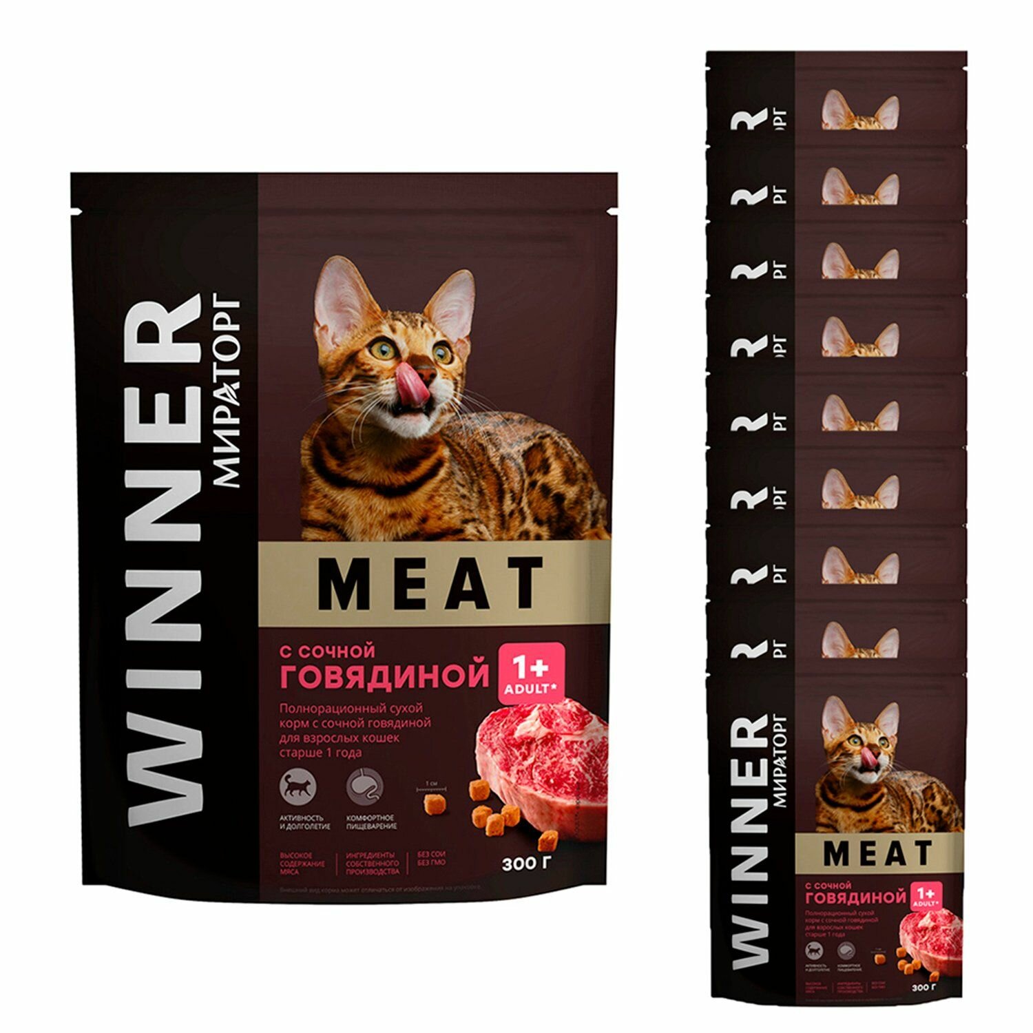 Купить Сухой полнорационный корм Мираторг WINNER MEAT 10х300гр для взрослых кошек старше 1 года всех пород с сочной говядиной