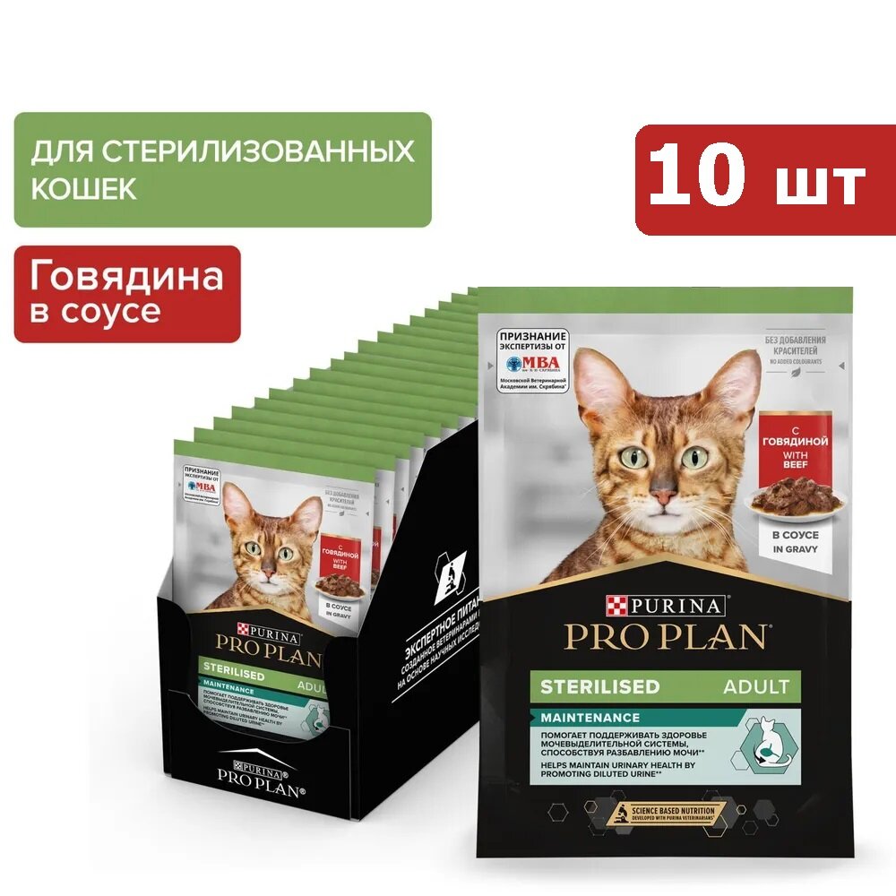 Влажный корм Pro Plan (Проплан) Sterilized для стерилизованных кошек с говядиной 10 шт.*85 г (кусочки в соусе)
