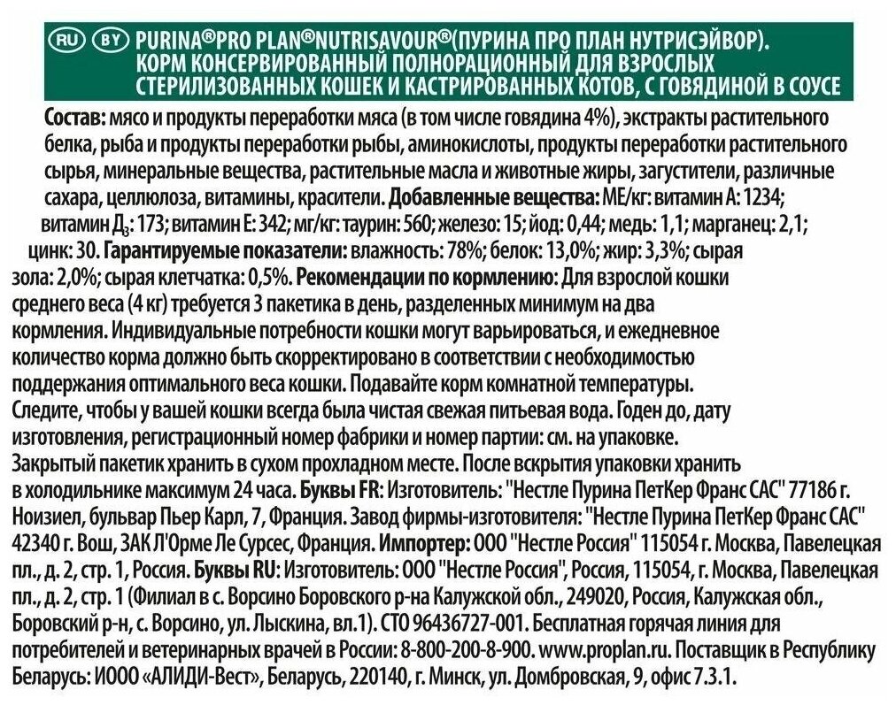 Pro Plan Nutrisavour Sterilised пауч для стерилизованных кошек и котов (кусочки в соусе) Говядина, 85 г. упаковка 26 шт