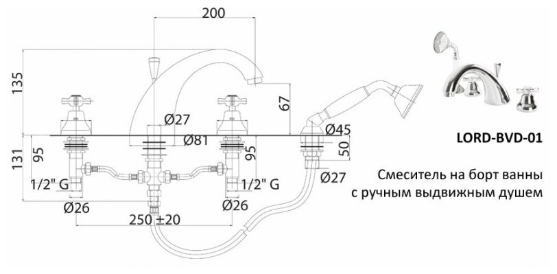 LORD-BVD-03/24 Смеситель на борт ванны с ручным выдвижным душем золото, ручки золото