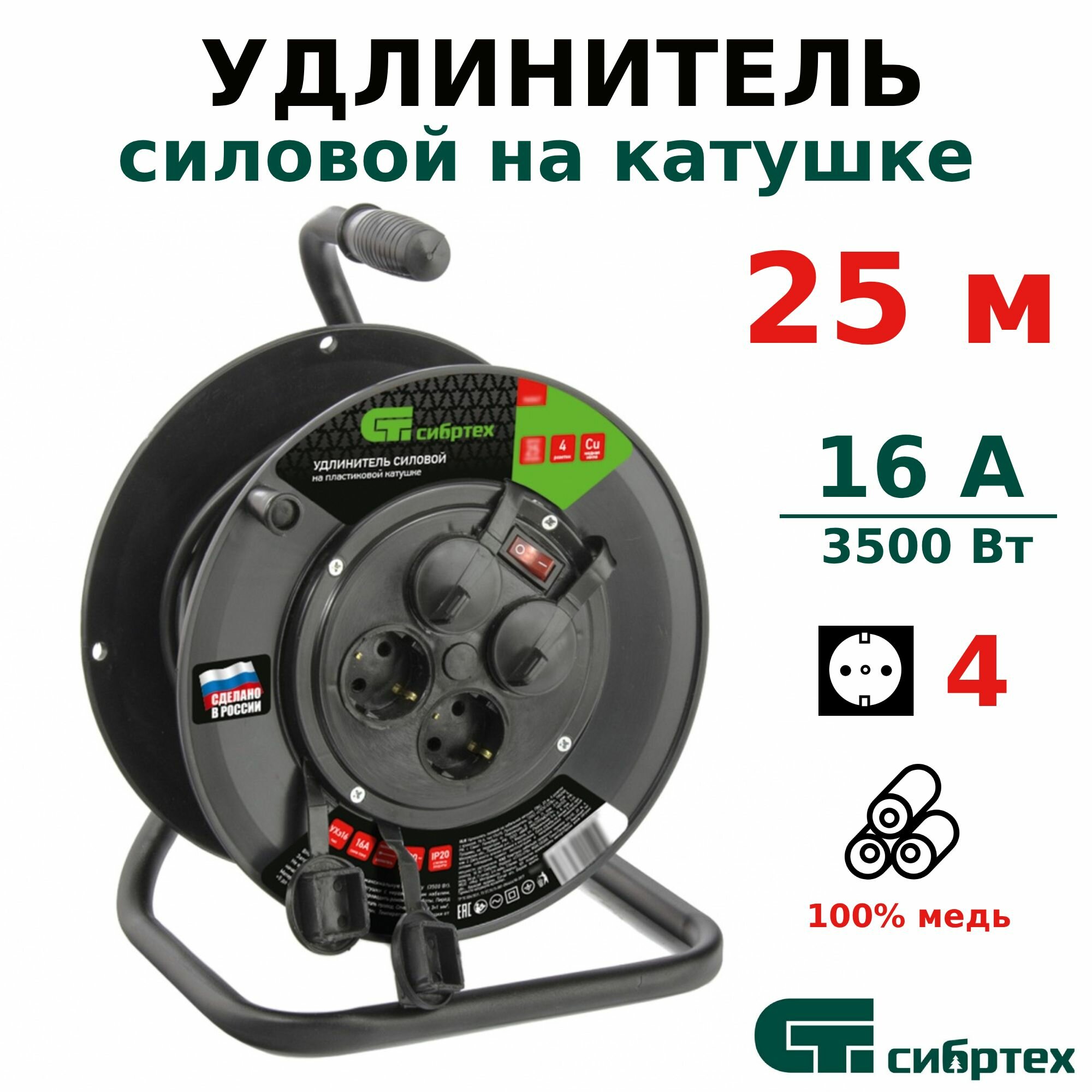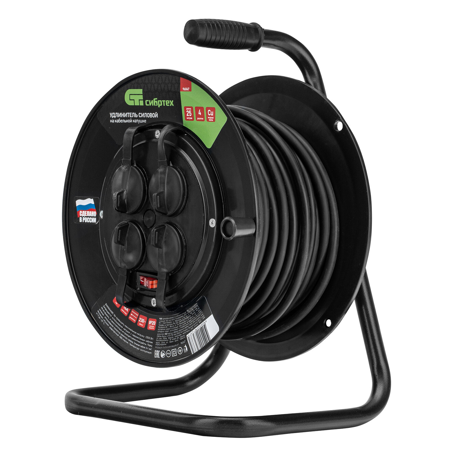 Удлинитель силовой 25 м, 16А, тип УХз16, ПВС, на кабельной катушке, 4 розетки, Россия Сибртех