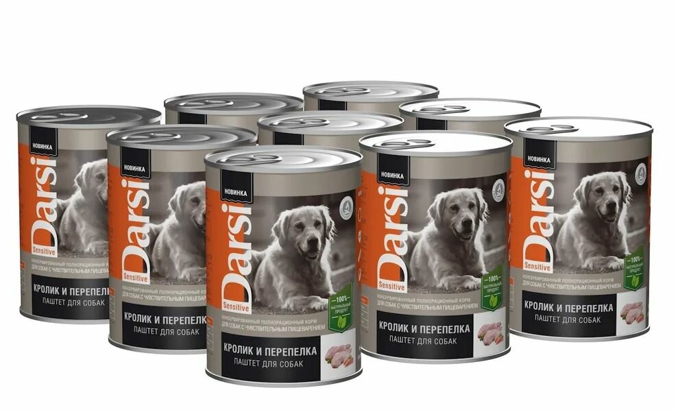 Консервы (паштет) для собак с чувствительным пищеварением DARSI Кролик и Перепелка, 9 шт. х 410г