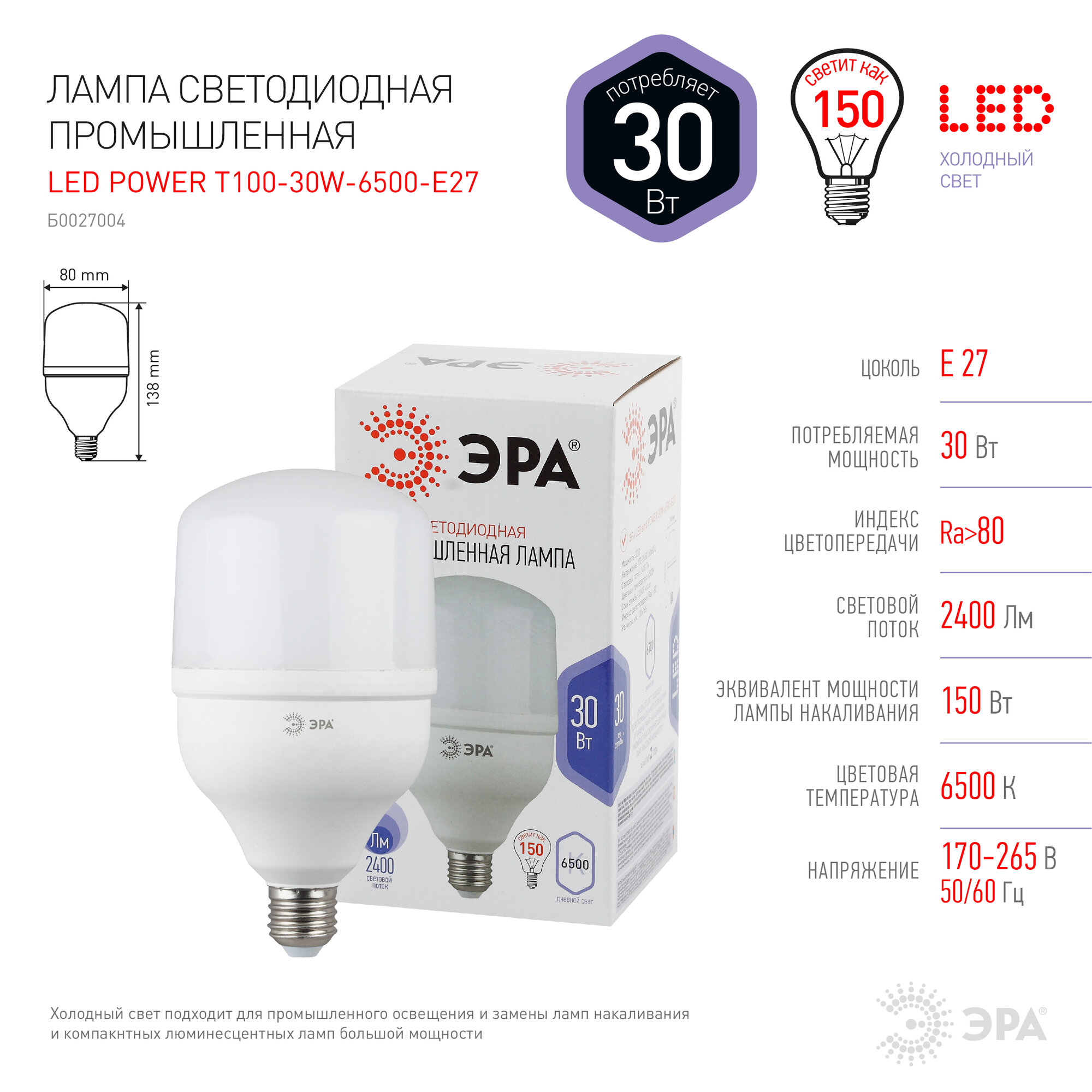 LED POWER T100-30W-6500-E27 Лампа ЭРА (диод, колокол, 30Вт, хол, E27)