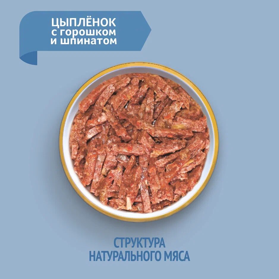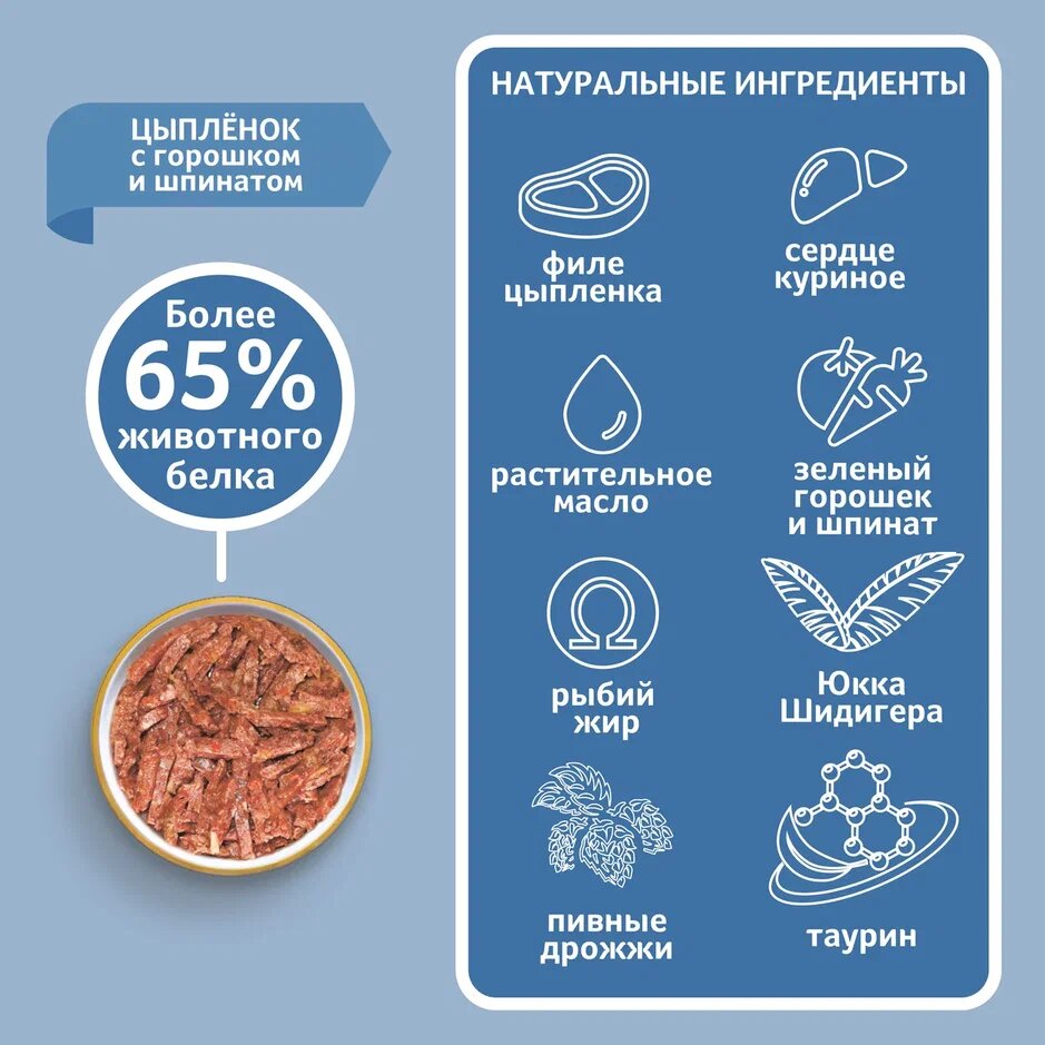 | Состав | филе цыплёнка, сердце куриное, бульон куриный, зелёный горошек, шпинат, масло растительное, желирующая добавка, рыбий жир, пивные дрожжи, морские водоросли, экстракт Юкка Шидигер |