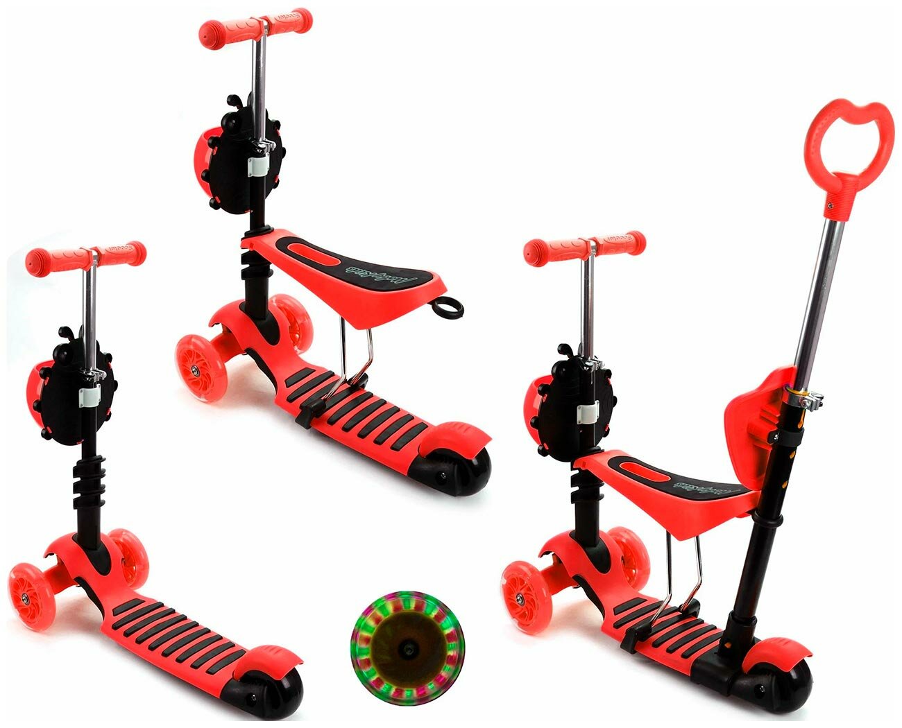 Самокат MobyKids Божья коровка 3 в 1, свет. кол., красный