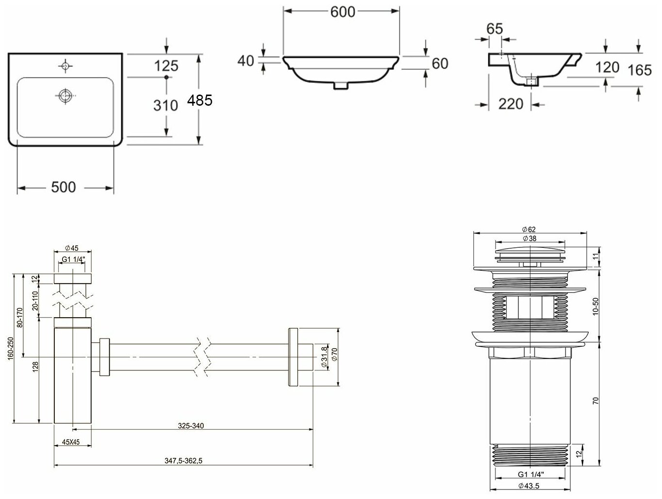 Комплект 3 в 1 Lavinia Boho Bathroom Sink 21520393: врезная фарфоровая раковина 60 см, металлический сифон, донный клапан