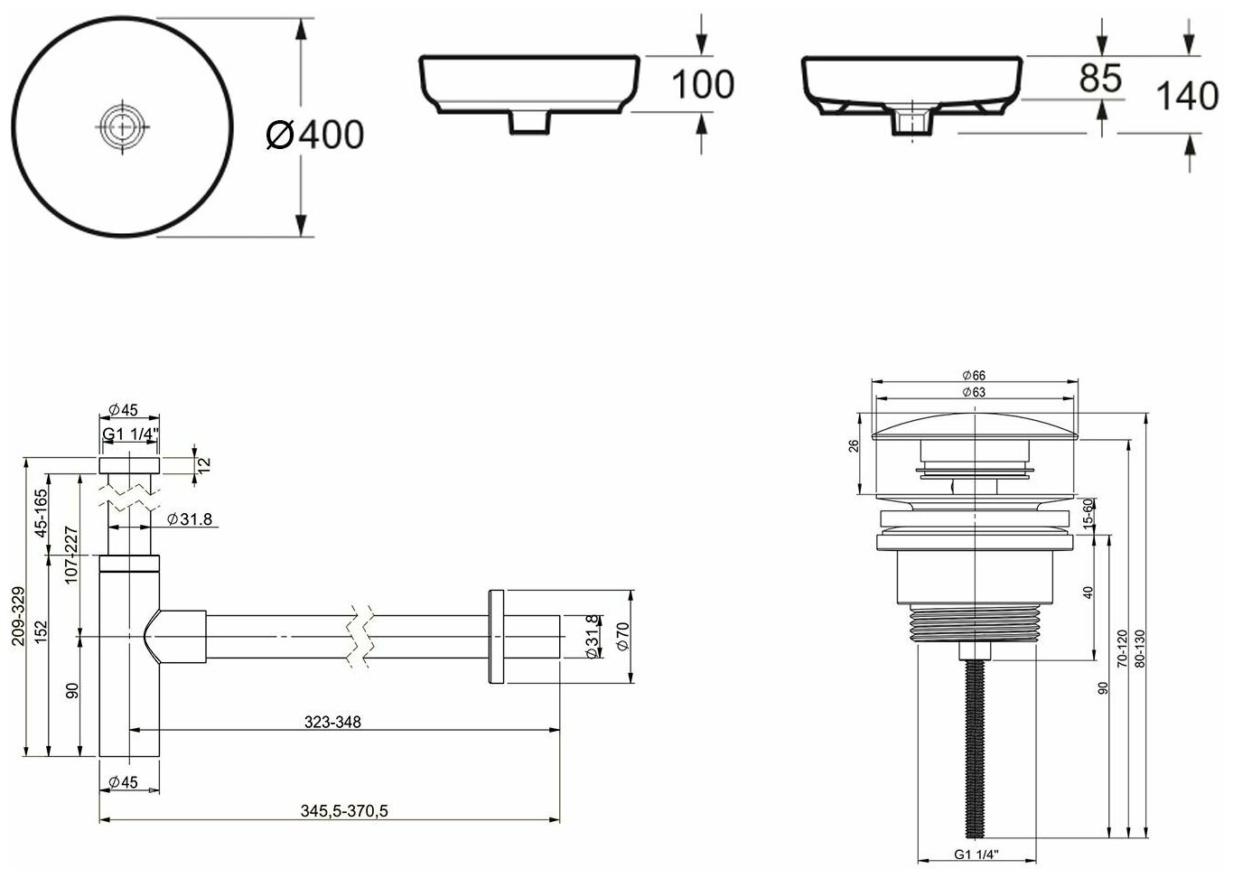 Комплект 3 в 1 Lavinia Boho Bathroom Sink 21520206: накладная фарфоровая раковина 40 см, металлический сифон, донный клапан