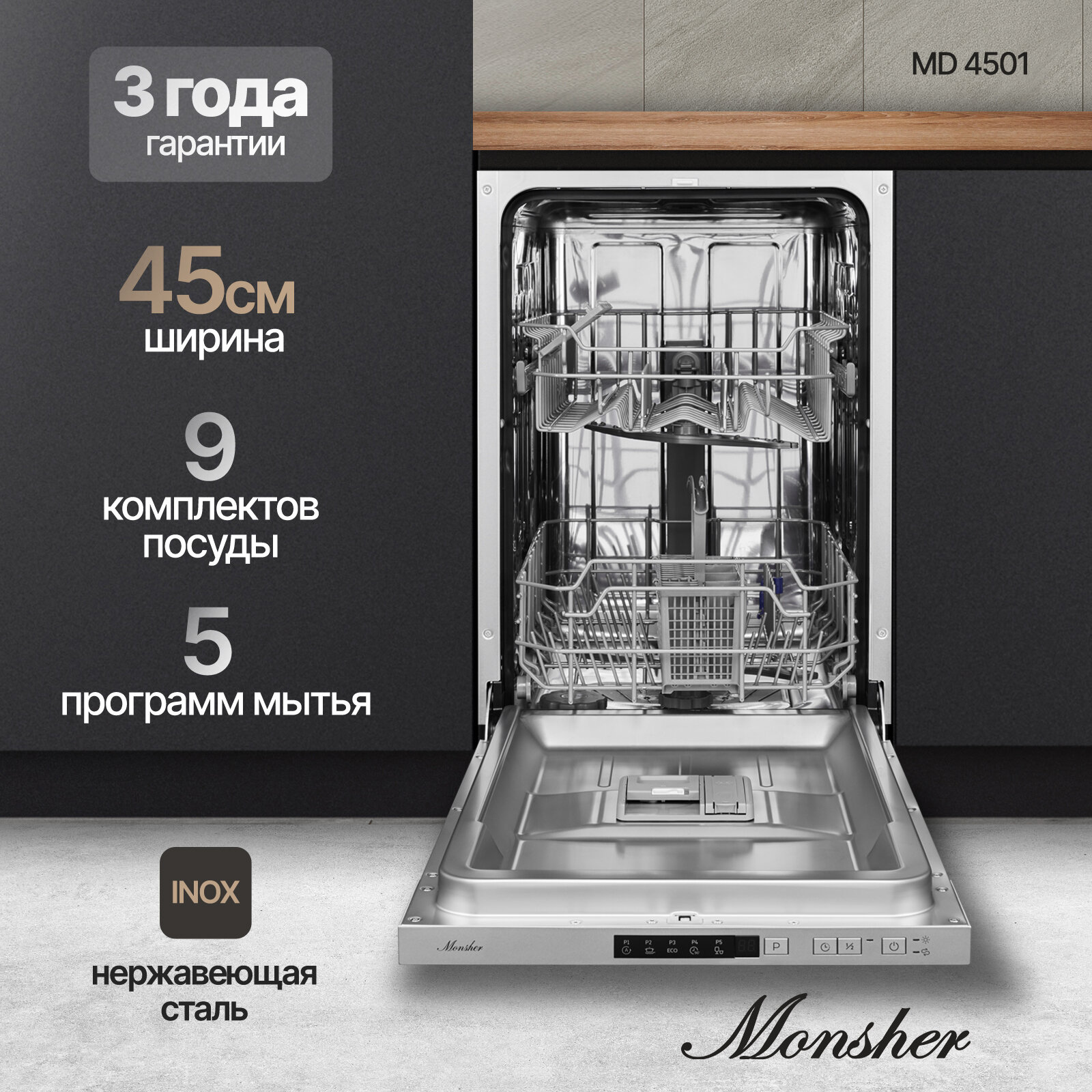 Посудомоечная машина встраиваемая Monsher MD 4501 (модификация 2023 года) интересное: