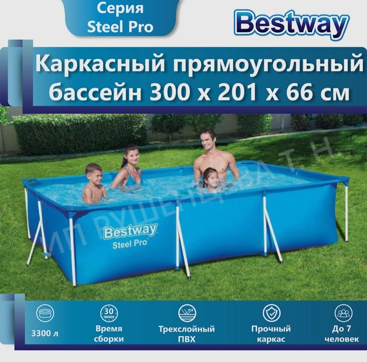 Каркасный прямоугольный бассейн Bestway Steel Pro, 300х201х66 см, 3300 л, 56404