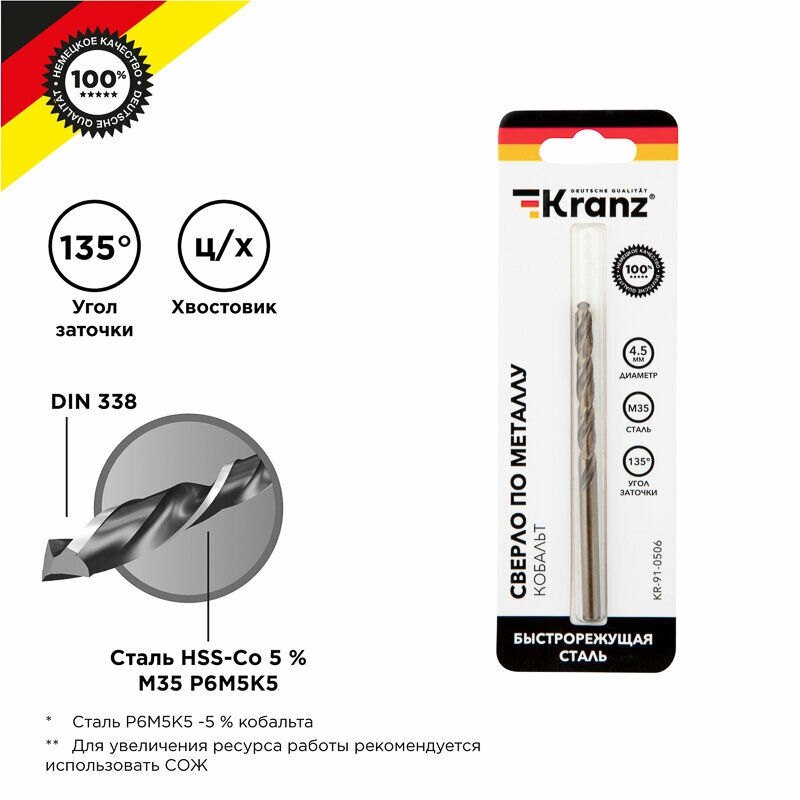Сверло по металлу 4.5мм «Кобальт» (сталь HSS-Co 5% M35 P6M5K5) DIN 338 (блист.1шт) Kranz KR-91-0506