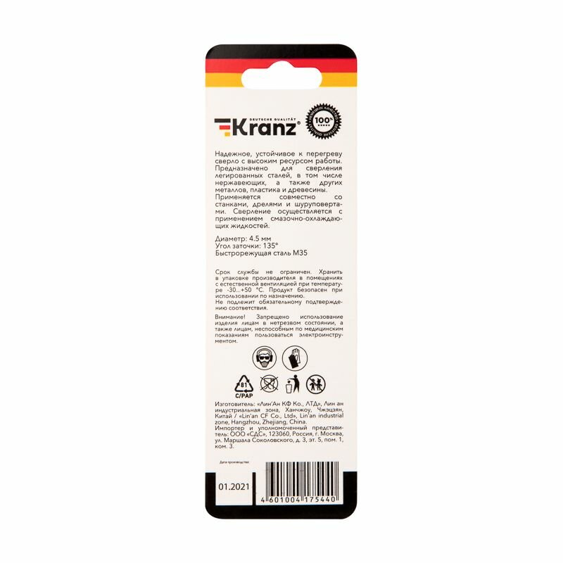 СохранитьСверло по металлу KRANZ 4,5 мм, с добавлением кобальта повышенной прочности, стандарт качества DIN 338 интересное: