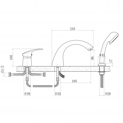 Однорычажный смеситель на борт ванны Fashun A1121 с фиксированным изливом и душевым гарнитуром.
