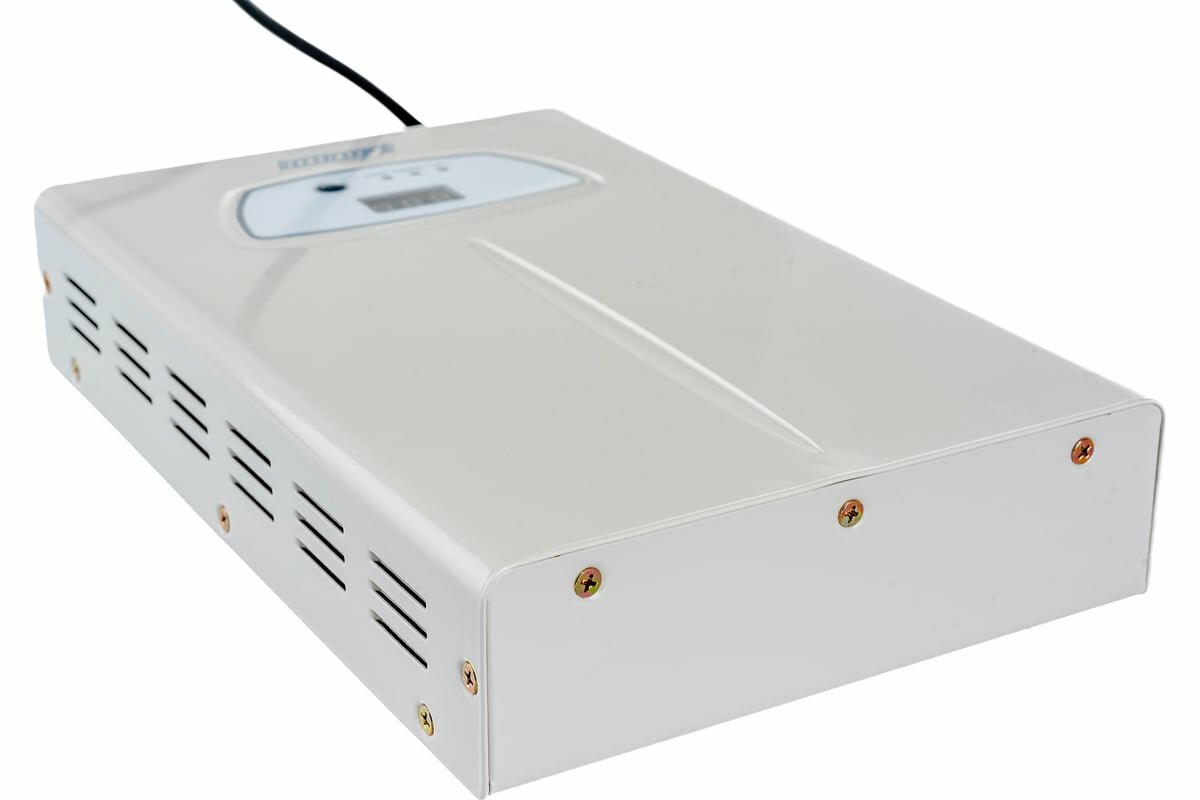 Благодаря плоскому дизайну стабилизатора, удалось спрятать его за телефизор и его не видно. Теперь я не волнуюсь, что техника выйдет из строя из-за частых перепадов напряжения. Вобщем пощекливает, работает на УРА!!! |