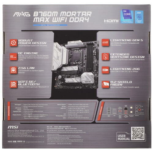 MicroStar MSI MAG B760M MORTAR MAX WIFI DDR4 RTL {Soc-1700 Intel B760 4xDDR4 mATX AC`97 8ch(7.1) 2.5Gg+HDMI+DP}