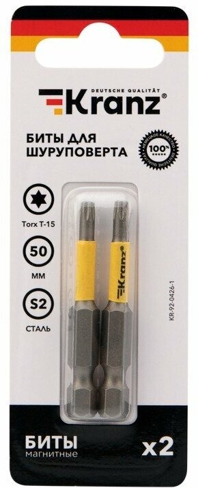 Биты для шуруповертов KRANZ с магнитным наконечником Torx T15х50 мм, 2 шт