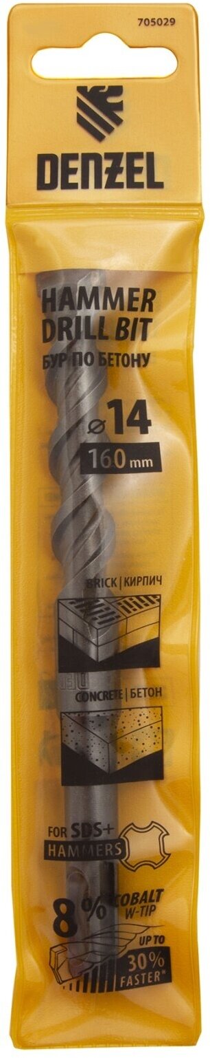 Бур по бетону, двойная спираль, Cobalt W-tip, 14x160 мм, SDS PLUS, DENZEL 705029