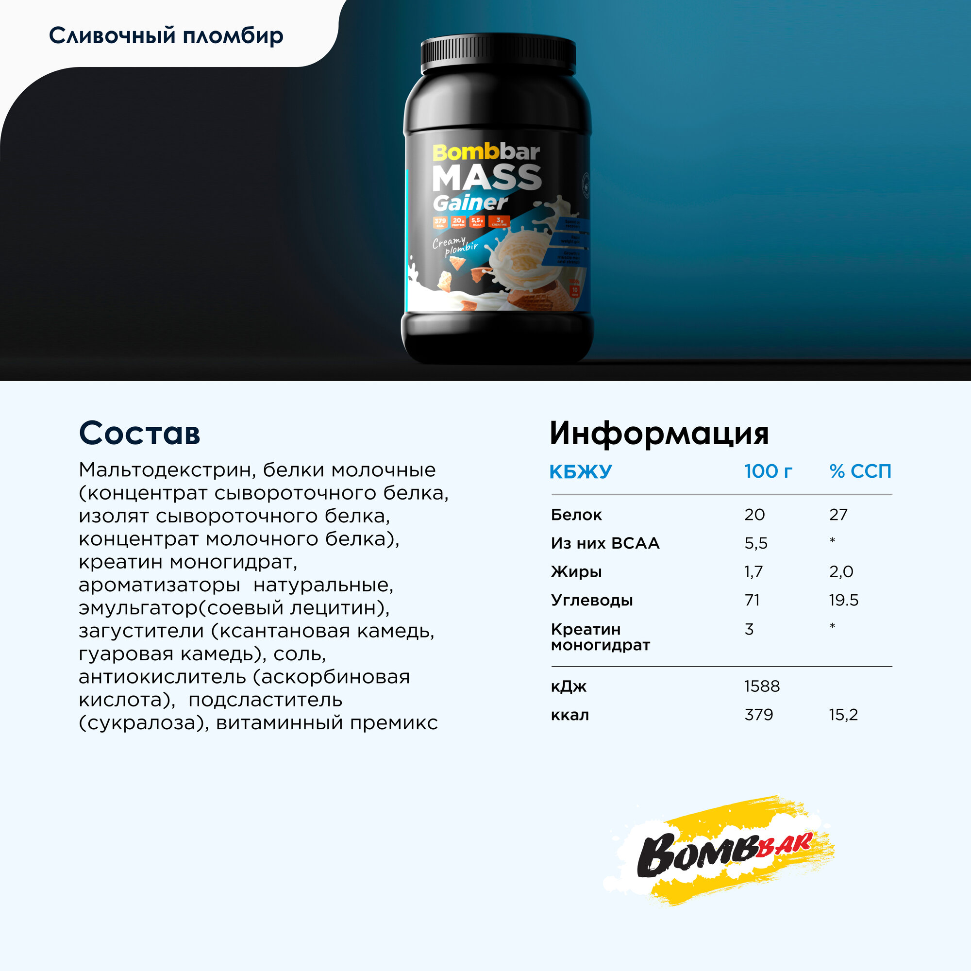 Гейнер Bombbar Pro Сливочный Пломбир 1000г / Bombbar MASS Gainer