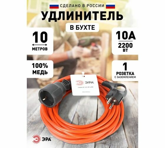 Удлинитель шнур силовой ЭРА UPx-1e-3x1-10m в бухте с заземлением, провод ПВС 3х1мм2 оранжевый, 1 штепсельное гнездо 10м, Б0048677 / электрика