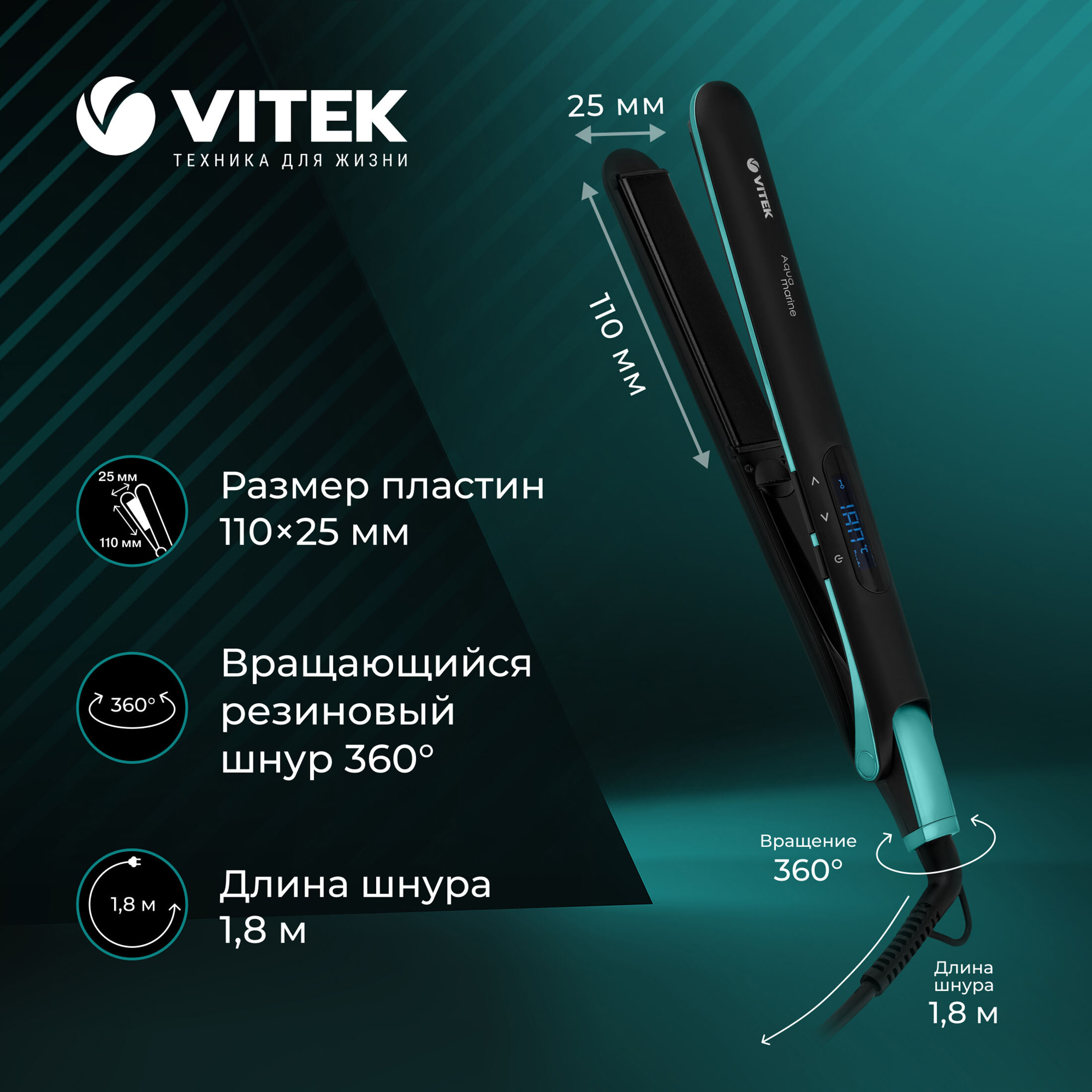 Выпрямитель VITEK Aquamarine VT-1335, черный/голубой