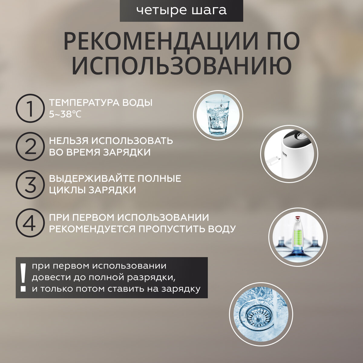 | Плюсы: | Работает! Зарядки хватает на бутыль 19л точно. |