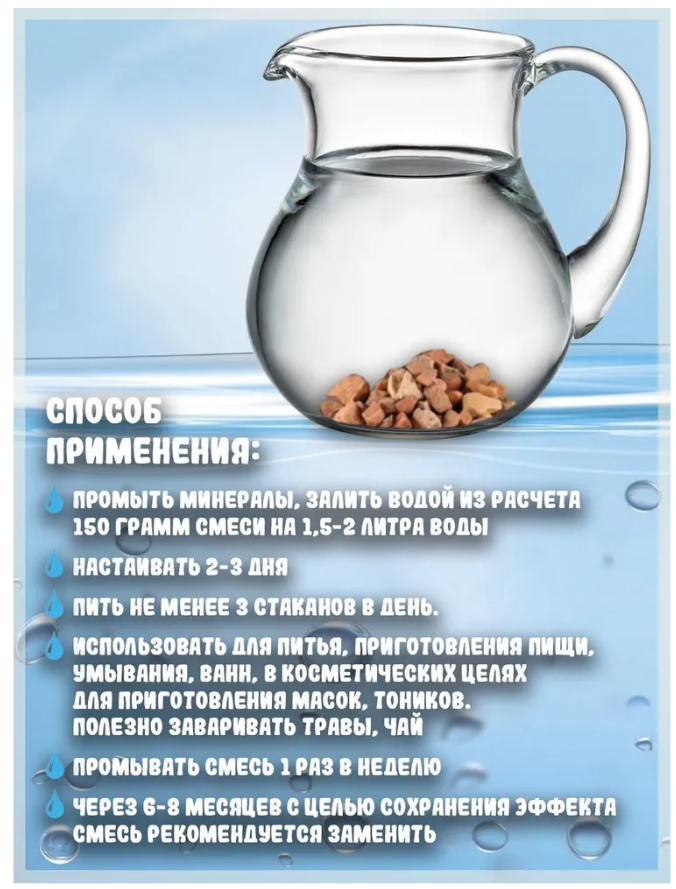 | Плюсы: | Очень полезный минерал для настаивания и структуриравания воды. Пью воду, оздаравливаю суставы и т.д. |